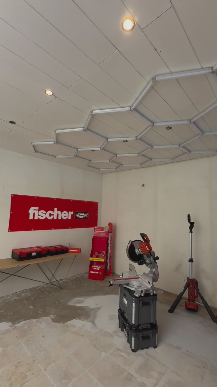 Frei kombinierbare LED-Panels als Hexagon für eine helle und kräftige Ausleuchtung deiner Garage, Halle, Werkstatt oder Showroom. Unsere Hexagon Deckenbeleuchtung entspricht dem EU Standard und bietet einen 3-adrigen Anschluss (inklusive Erdung!). Zudem besitzt die Beleuchtung ein CE RoHS Zertifikat.
